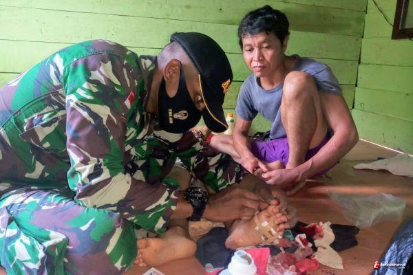 Dengan sigap, Tamtama Kesehatan (Takes) Pos Muakan Pratu Falldo dan Prada Yosef segera mengobati luka yang dialami korban. "Saat tiba dirumah Bapak Encalok, Dua anggota Pos Muakan langsung melakukan pertolongan pertama dengan membersihkan kemudian menjahit luka sebanyak 10 jahitan pada kaki anaknya,” ucap Dansatgas.