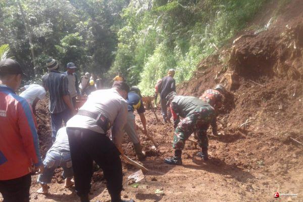 Personil Babinsa Koramil 1707/Lemahsugih bersama warga setempat bergotong royong membersihkan material tanah yang menutupi badan jalan, pada Minggu (28/2/2021).