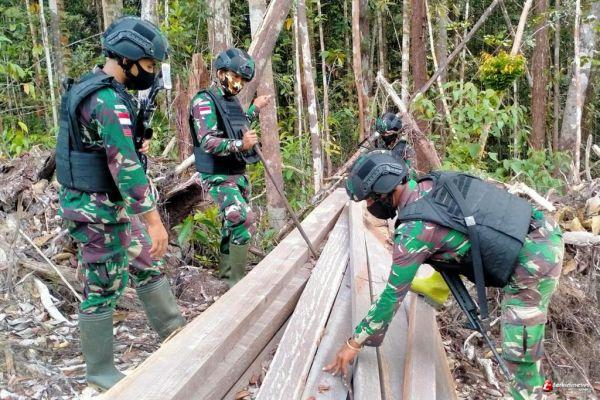 Patroli Patok, Satgas Yonif 407 Temukan Kayu Olahan Diduga Hasil Pembalakan