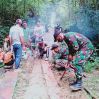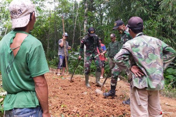 KALIMANTAN- Personel Pos Kampung Jasa Satgas Pamtas RI-MLY Yonif 407/PK yang dipimpin oleh Kopda Eko bersama masyarakat bergotong-royong melaksanakan perbaikan jalan akses warga Dsn. Wakampuh, Ds. Jasa, Kec. Ketunggau Hulu, Kab. Sintang, Kalimantan Barat. Selasa (09/03/21).