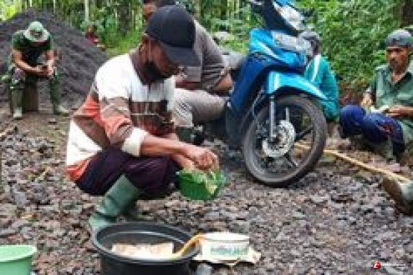 Kabupaten Semarang - Di sela-sela kegiatan pengecoran jalan Koptu Agus(37) salah satu anggota Satgas TMMD Reguler ke-110 Kodim 0714/Salatiga bersama warga Desa Ketapang Kecamatan Susukan, Kabupaten Semarang.