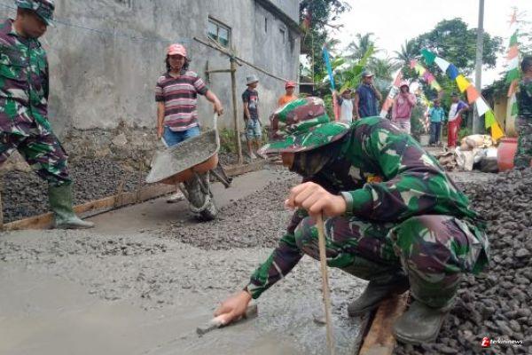 Kabupaten Semarang - Kopda Santo bersama warga membantu melanjutkan pekerjaan pengecoran jalan di Desa ketapang, Kec Susukan, Kab. Semarang.