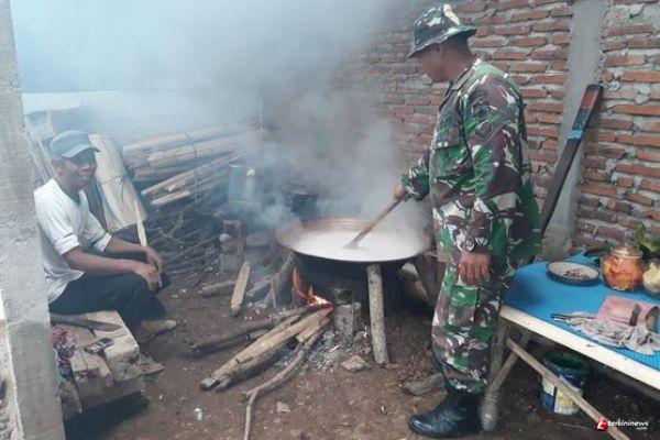 Salah satu personel Satgas TMMD ke 110, sertu budi terlihat sedang membantu mengaduk jenang makanan tradisional untuk disuguhkan kepada anggota satgas yang berada di lokasi TMMD.