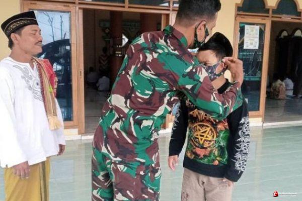 Kabupaten Semarang- Sertu Heri memberikan masker warna loreng kepada Fadli (10) saat mau melaksanakan ibadah Sholat Jum'at di Masjid At Taqwa Desa Ketapang Kecamatan Susukan Kabupaten Semarang, Jum'at(12/03/2021)