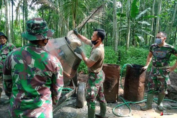 “Mari kita mulai lagi, segera siapkan semen, koral, dan pasir. Masukkan ke molen,” teriak seorang anggota Satgas TMMD Kopda Bagus(32).