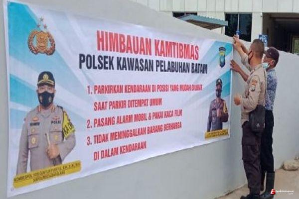 BATAM - Mengantisipasi kejahatan di kawasan pelabuhan yang berada di Kota Batam, Polsek KKP Batam, melakukan pemasangan spanduk imbauan Kamtibmas yang berisi "Jangan Meninggalkan Barang Berharga di Dalam Kendaraan Saat Parkir".