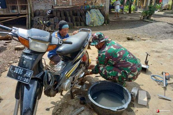 Koptu Listiyono(38) Satgas TMMD,di sela kesibukanya melaksanakan pekerjaan pembangunan MCK di musholla Al Huda Dusun Sarimulyo RT 02 RW 04 Desa Ketapang.ia membantu masyarakat menambal ban motor yang bocor terkena paku"semoga setelah di tambal tidak bocor lagi"ucap Listiyono kepada warga sekitar TMMD.