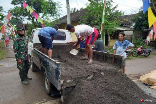 Kabupaten Semarang - Bintara Pembina Desa (Babinsa) Desa Ketapang Kecamatan Susukan Kabupaten Semarang, ikut mengawasi pelaksanaan perbaikan jalan betonisasi di Desa Ketapang.