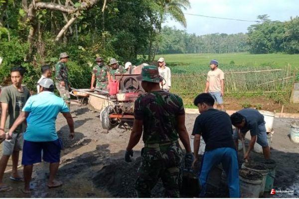 Bersama masyarakat Dusun Sarimulyo dan Dusun Karangasem, Serka Ardi tampak semangat lakukan pekerjaan pembangunan jalan.