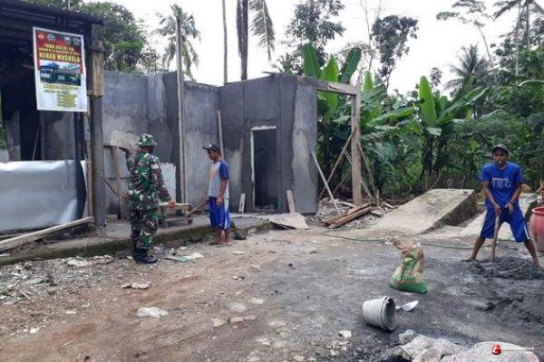 Nampak Sertu Suhadi dan warga yang sedang menyelesaikan dinding tembok rehab tempat wudhu dan kamar mandi nya sudah memasuki tahap akhir penutupan atap juga sudah di datangkan sebagai antisipasi cuaca yang tidak menentu apabila turun hujan bisa dimanfaatkan untuk berteduh.