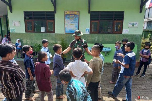 Serda Sutrisno salah satu personil TMMD ke-110 sengaja mengajak bermain anak-anak di Desa Ketapang yang saat ini sedang tidak melakukan belajar di sekolah karena pandemi Covid-19.