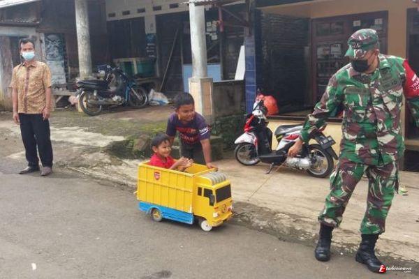 Kebersamaan itu terlihat saat sertu agung ikut bermain mobil mobilan dengan andri (10) dan arfin (3) warga Desa Ketapang Kecamatan Susukan Kabupaten Semarang, Selasa (16/03/2021).