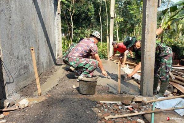 Bersama masyarakat Dusun Sarimulyo, Peltu Bowo dan anggota Satgas TMMD lainnya nampak sedang guyub rukun melakukan pekerjaan pemlesteran Lantai Musholla Al Huda.