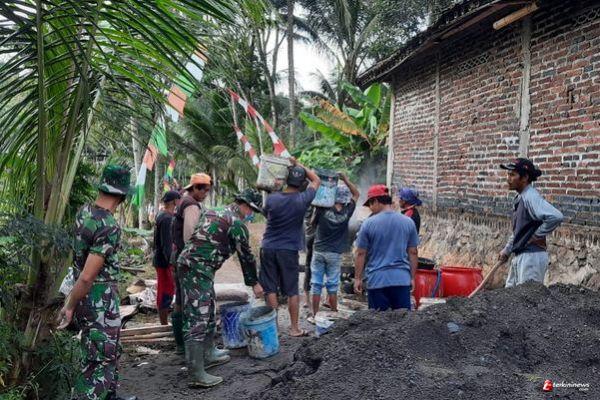 Dibantu oleh Sertu Koeng, Harmanto bersama masyarakat Desa Ketapang tampak sedang menyiapkan ember untuk diisi dengan pasir yang siap di dustribusikan di tempat pengecoran jalan Dusun Ketapang.