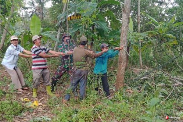 Koptu Listiyono(38) melihat warga yang sedang menarik pohon, dia bergegas membantu karena di rasa dengan bantuannya, pohon yang di tarik bisa cepat roboh "Ayo tarik, satu dua tiga" ucapnya saat membantunya.