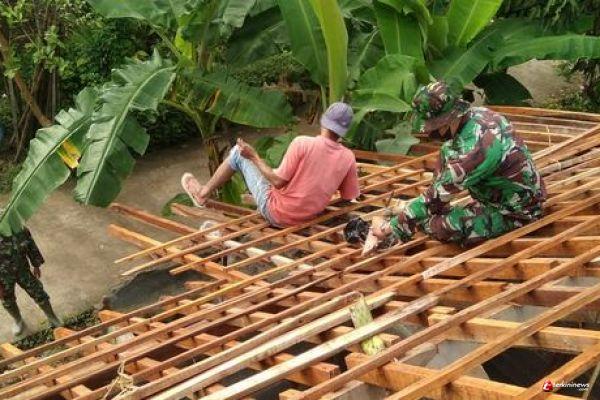 TNI dan Warga Mengerjakan Atap Rumah Suyitno