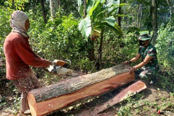 "Saat saya berjalan melintasi Dusun karang asem,kebetulan melihat pak Wagio sedang mengupas kayu mahoni yang baru saja ditebangnya, kebetulan beliau sendirian yang tentunya sedikit kesulitan dalam mengupas dan membelah kayu, akhirnya saya bantu pegangi kayunya agar tak bergerak-gerak sehingga kupasanya lurus", jelas Serda Eko.