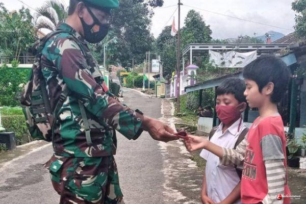 Saat Satgas TMMD Regular ke 110 Kodim 0714/ Salatiga sedang hendak menuju lokasi TMMD dan melewati anak anak yang tengah asik bermain tanpa masker, langsung saja Sertu Heri mengambil masker dan memberikannya kepada Hidan(10).