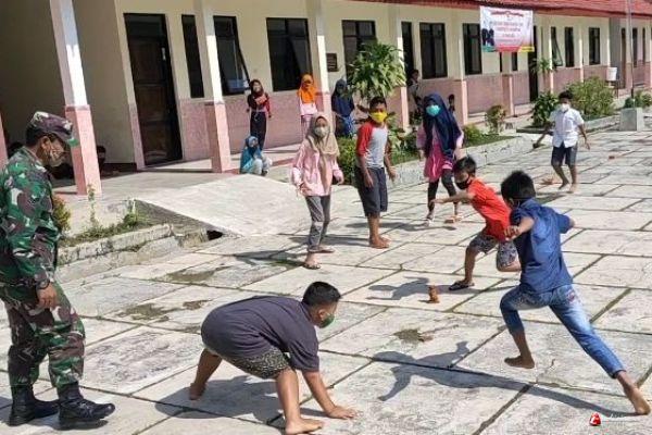 Lihat Pecahan Genting, Babinsa Ajak Anak anak Main Gem Geman