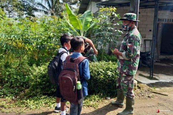 Kabupaten Semarang- Satgas TMMD Reg-110 Kodim 0714/Salatiga, Serda Purwoko sejenak menghentikan sejenak langkah kedua Siswa SDN Ketapang 1 saat pulang sekolah, Minggu (21/03/2021)