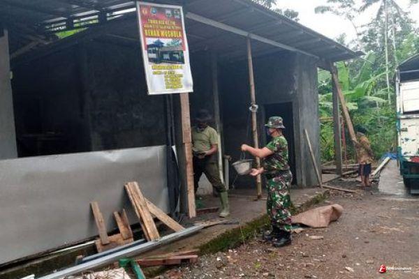 Selanjutnya Peltu Bowo melanjutkan pekerjaan mengaci tiang Musholla Al-Huda 2 dengan dibantu oleh Sertu Sugeng sebagai partner yang menyiapkan adukan semen. (Pendim 0714/Salatiga*).