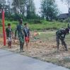 Prajurit Satgas Pamtas RI-Malaysia Yonif 407/PK Pos Sei Kelik melaksanakan kegiatan karya bhakti bersama masyarakat membersihkan lapangan Voly di Desa Sungai Kelik, Kecamatan Ketungau Hulu, Kabupaten Sintang, Kalimantan Barat. Sabtu (20/03/21).