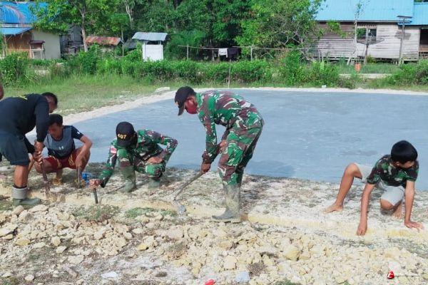 Satgas pamtas Yonif 407/PK Bersama Warga Karya Bhakti Bersihkan Lapangan Voly