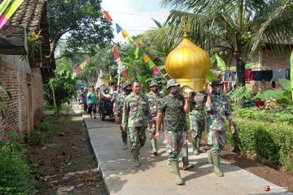 Kabupaten Semarang- Anggota Satgas TMMD ke -110 kodim 0714/Salatiga melaksanakan tradisi arak Kubah Mushola Al Huda sebelum dinaikkan, di bawa dulu keliling Desa Ketapang, Minggu (21/03/21).