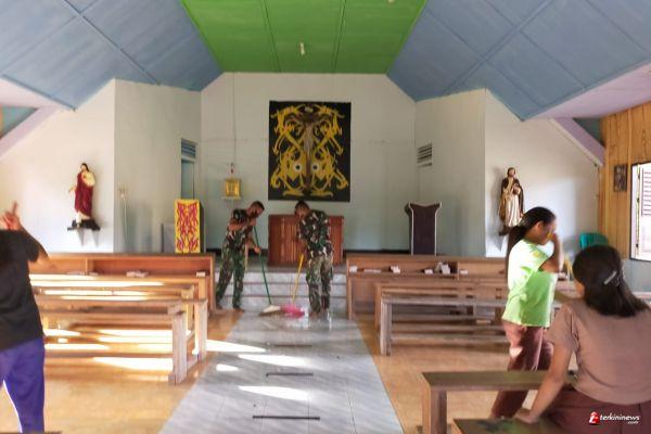 Wujud Toleransi Umat Beragama, Satgas Pamtas Yonif 407/PK Bersama Warga Bersihkan Tempat Ibadah