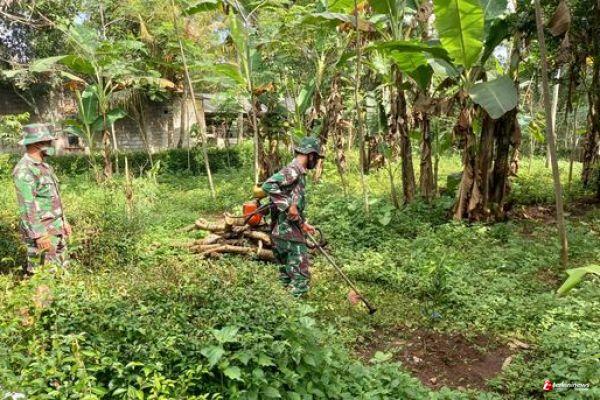 Kabupaten Semarang– Anggota Satgas TMMD Ke-110 Kodim 0714/Salatiga Serda Sutrisno bergotong-royong bersama rekan anggota satgas TMMD melakukan pembersihan rumput di lahan samping Mushola Al Huda Dusun Sari mulyo Rt 03 Rw 04 Desa Ketapang Kecamatan Susukan, Minggu (21/03/2021)