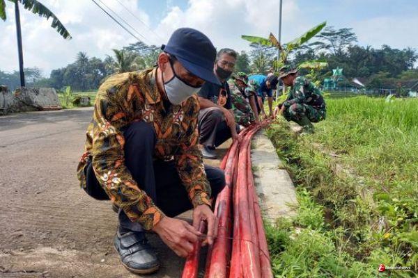 Kabupaten Semarang- Satgas TMMD Reg-110 Kodim 0714/Salatiga menyiapkan bambu untuk memasang umbul-umbul di sepanjang jalan Desa Ketapang Kecamatan Susukan Kabupaten Semarang, Minggu (21/03/2021)
