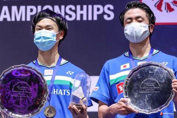 Japan's Yuta Watanabe, left, and Hiroyuki Endo celebrate at the podium after winning the men's doubles final match of the All England Open Badminton Championships at the Utilita Arena in Birmingham, England, Sunday March 21, 2021. (AP Photo/Rui Vieira)Endo/Watanabe jadi juara di nomor ganda putra All England. (AP/Rui Vieira)