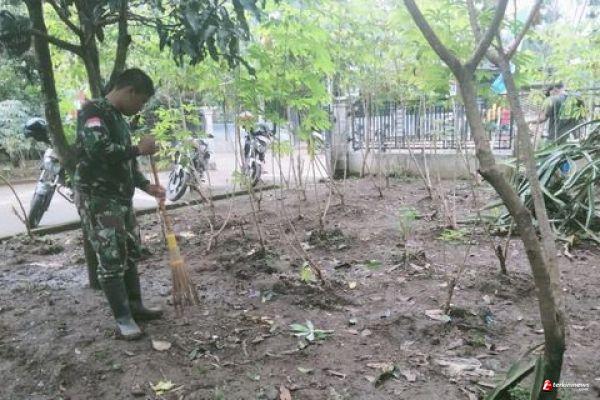 Anggota Satgas TMMD Bersihkan lingkungan di Depan Rumah Warga