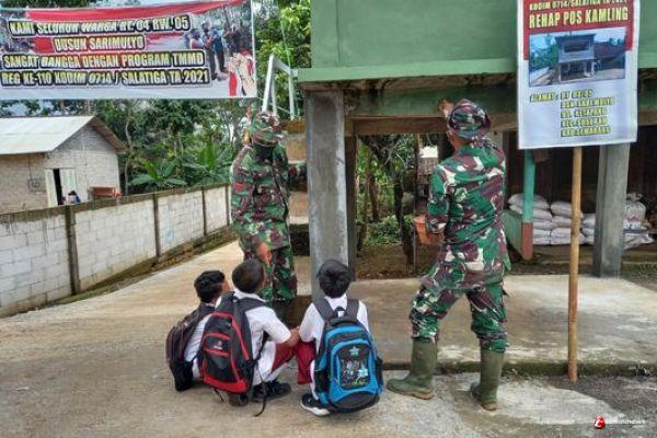 Kabupaten Semarang- Koptu Subroto beserta Praka Agus melanjutkan pengecatan Pos kamling Dusun Sarimulyo Rt 03/05 Desa Ketapang terhibur dengan kedatangan anak-anak SDN Ketapang 2 yang baru saja pulang sekolah, Selasa ( 22/03/2021)