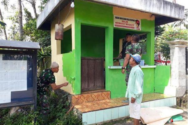 Satgas dan masyarakat desa ketapang. Bekerjasama bergotong royong dalam proses pengecatan.