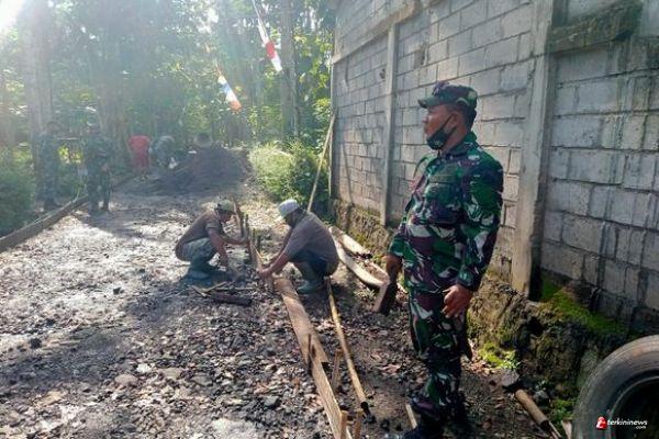 Tampak Kapten Infanteri Romdani, Danramil 09/Ambarawa, bersama Sarmin (45 tahun), sedang mempersiapkan pemasangan papan pembatas untuk pengecoran jalan rabat beton di Desa Ketapang.
