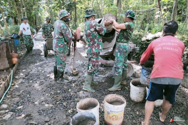 Kabupaten Semarang- Sejumlah prajurit TNI dari Kodim 0714/Salatiga bersama warga setempat bahu- membahu melaksanakan pengecoran jalan di Desa Ketapang yang berlokasi di Dusun Sari Mulyo ,Desa Ketapang Kecamatan Susukan Kabupaten Semarang, Rabu (24/03/2021).