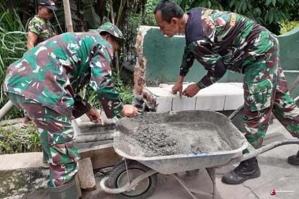 Sertu Anwari bersama Koptu Haris membenahi dan menembel saluran air belakang Musholla Al Huda 1 dengan campuran semen dan pasir, Selasa (23/03/2021)