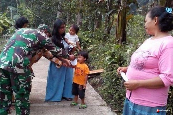 Langkah Serma Juni dihentikannya untuk memberikan masker kepada Riki (4), putra dari ibu Karni (38) yang kebetulan tidak memakai masker.