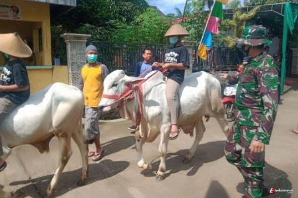 Serda Agung(45) mengikuti arakan sapi yang sudah menjadi tradisi mulai nenek moyang mereka dahulu, dengan maksud sebagai ucapan rasa syukur dengan adanya TMMD didesanya, dengan di tunggangi seorang anak kecil menggunakan caping dan pakaian warna seragam, terlihat sapi ikut saja, kemana mau di bawa.