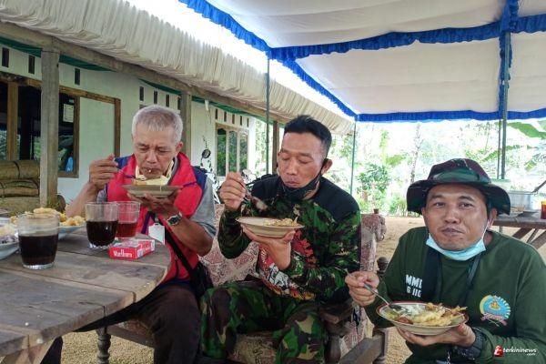 Bekerja sama demi mensukseskan program TMMD Regular ke 110 Kodim 0714/ Salatiga terjalin tidak hanya antara warga dan Satgas, tetapi dengan Team wartawan tampak selalu sinergi, baik waktu bekerja maupun waktu istirahat. Saat makan siang terlihat team wartawan dan Satgas tengah kompak makan soto hasil olahan ibu ibu setempat.
