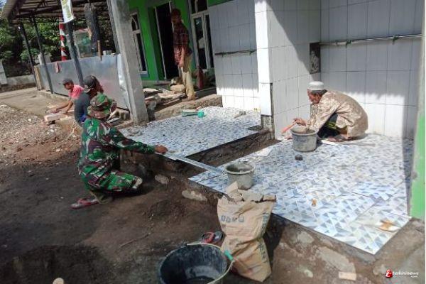Koptu Listiyono, salah satu anggota Satgas TMMD, yang sedang membantu pemasangan keramik di musholla Al Huda, sesekali memperhatikan kelurusan agar hasilnya bagus seperti yang di harapkan.