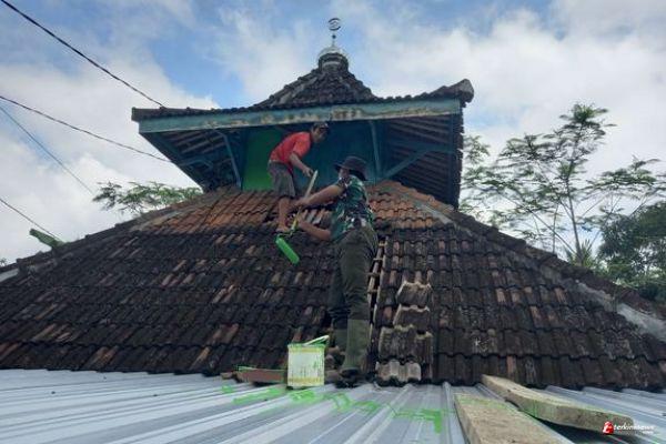 Kabupaten Semarang- Personel Satgas TNI Manunggal Membangun Desa ke 110 Kodim 0714/Salatiga bersama warga saat ini bergotong royong melakukan pengecatan atap dinding Mushola Al Huda 2 Dusun Sari mulyo Rt 03 Rw 05 Desa Ketapang Kecamatan Susukan, Kamis(25/03/21)