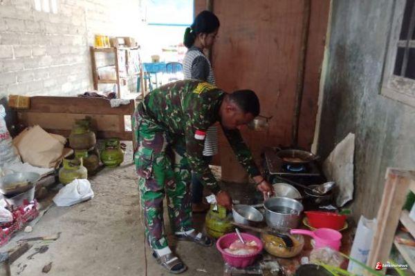 Serda Yudi anggota Satgas TMMD Yonif 410/Alugoro salah seorang, ikut membantu Rini, seorang warga Desa Sarimulyo, yang sedang memasak di dapurnya yang sederhana, dimana hasil masakannya akan disajikan untuk makan siang anggota Satgas TMMD dan Warga desa, yang tengah melakukan pekerjaan Rehab rumah milik Khabibi.