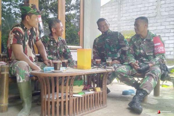 Kabupaten Semarang - Pasiter Kodim 0714/Salatiga, Kapten Inf Sofyan Amirudin, terlihat tertawa ceria saat melepas lelah di waktu istirahat sambil ngopi bersama anggota Satgas TMMD di salah rumah Sunarto (55 tahun) warga Dusun Karang asem RT 04 RW 06 Desa Ketapang Kecamatan Susukan Kabupaten Semarang.