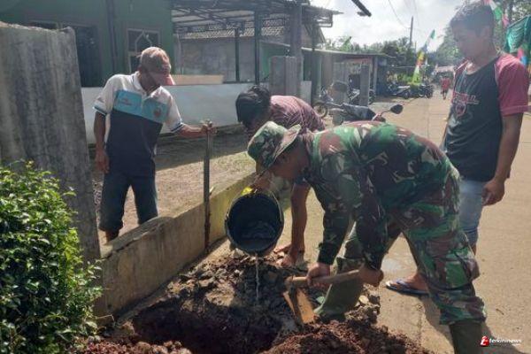 Kabupaten Semarang - Meski sibuk mengejar target sejumlah sasaran fisik TMMD Reguler 110 Kodim/Salatiga, Kopda Heri masih sempat membantu memperbaiki saluran air yang rusak milik warga Dusun Sarimulyo Desa Ketapang Kecamatan Susukan Kabupaten Semarang.