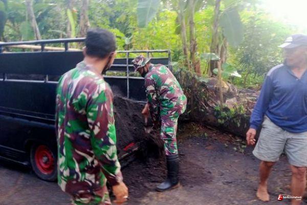 Kabupaten Semarang, Satuan tugas TMMD Reguler ke 110 Kodim 0714/Salatiga Terlihat bersama sama warga menurunkan Pasir dari atas mobil pick Up bertempat di Dusun Karang Asem Desa Ketapang Kecamatan Susukan.
