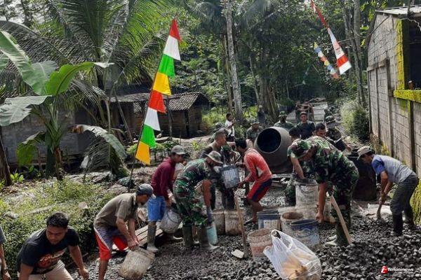 Kabupaten Semarang - Pembangunan jalan rabat beton belum selesai, anggota satgas dan seluruh masyarakat Desa Ketapang, semua berbaur menjadi satu saling bahu-membahu melanjutkan pekerjaan pengecoran jalan rabat beton.