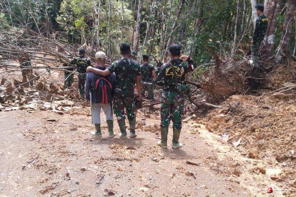 PENGKADAN - Anggota Satgas TMMD Regtas ke-110 Kodim 1206/PSB, membantu pembersihan jalan akibat pohon tumbang yang melintang di jalan.