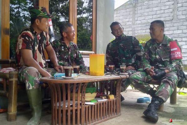 Kabupaten Semarang - Sambil tertawa riang Pasiter Kodim 0714/Salatiga Kapten Inf Sofyan Amirudin ini melepas lelah di saat jam istirahat sambil ngopi bersama anggota di Dusun Sari Mulyo Desa Ketapang Kecamatan Susukan, Sabtu (27/03/2021)